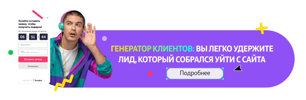 Люди любят бесплатные или товары со скидкой. Внедрите на сайт виджет Генератора клиентов, чтобы предоставить персональное предложением с истекающим сроком действия. Таймер обратного отсчета воздействует на FOMO, страх упустить уникальную возможность. Внедрите виджет для своего бизнеса бесплатно по ссылке и тестируйте эффективность в течение 8 пробных дней.